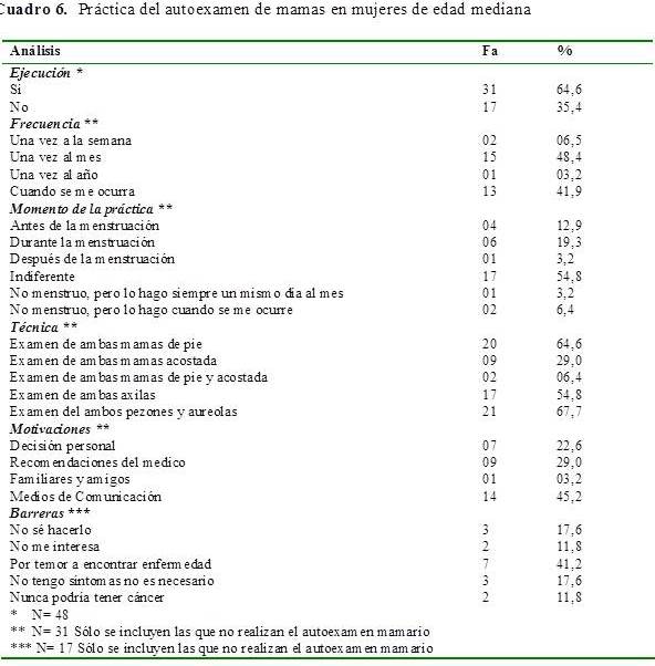 Resumen: OBJETIVO: Determinar el nivel de conocimiento sobre cáncer de mama y práctica del autoexamen de mamas (en mujeres de edad mediana atendidas en la consulta ginecológica de la Maternidad “Dr. Armando Castillo Plaza”, en Maracaibo, Venezuela. MÉTODO: Investigación de tipo exploratoria y descriptiva, con diseño no experimental y transeccional; se evaluaron 48 mujeres, mediante la aplicación de dos cuestionarios uno denominado “conocimiento sobre cáncer de mama” de 22 preguntas con respuestas cerradas tipo Lickert, previamente validado, con un coeficiente de test/retest de 0,94; y otro diseñado ad hoc para establecer la práctica del autoexamen. RESULTADOS: Al aplicar el cuestionario, se obtuvo una puntuación promedio de 45,3±10,9 puntos, presentando la mayoría de las encuestadas un nivel de conocimiento entre bueno (50 %) y regular (47,9 %) sobre aspectos generales del cáncer de mama, factores de riesgo, prevención y autoexamen. Asimismo, se encontró que 64,6 % de las mujeres practicaban el autoexamen, realizándolo mayoritariamente una vez por mes (48,4 %), en cualquier momento (54,8 %), de pie (64,6 %), incluyendo el examen de las axilas (54,8 %), pezón y aureola (67,7 %), y haciéndolo motivadas por los medios de comunicación social (45,2 %) o por recomendación médica (29 %). Sólo 35,4 % de estas pacientes no lo hacían, principalmente debido al temor a encontrar enfermedad” (41,2 %). CONCLUSIÓN: El nivel de conocimiento tanto sobre el cáncer de mama como del autoexamen y su práctica entre las mujeres de edad mediana es bueno.