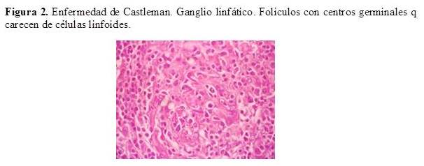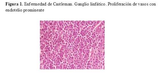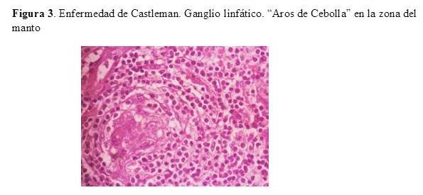 Paciente masculino de 51 años con diagnóstico de infección por el VIH mediante ensayo de ELISA y Western-blot en marzo del año 2005. Para ese momento, el paciente se encontraba asintomático con un examen físico normal, un nivel de linfocitos T-CD4 positivo de 694 células/µL y una carga viral de 3126 copias/mL. Desde esa fecha y hasta julio del año 2012 se mantuvo en excelentes condiciones con un promedio de linfocitos T-CD4 positivo de 488 células /µL (rango, 354- 694) y una carga viral promedio de 1843 copias/mL (rango, 559-3 126), en ningún momento recibió la TARV. En agosto del año 2012 consultó por presentar fiebre continua de un mes de evolución, y al examen físico se evidenció la presencia de adenomegalias cervicales y hepatoesplenomegalia, la IgM fue negativa para citomegalovirus y virus de Epstein-Barr, pero la IgG fue positiva para ambos virus. El paciente no acudió de nuevo a consulta hasta junio del año 2013 presentando en esta oportunidad fiebre ondulante, pérdida de 6 kg de peso en el transcurso del año, sudoración nocturna y persistencia del síndrome adenomegálico y hepatoesplénico. Las tomografías realizadas de cuello, tórax, abdomen y pelvis, mostraron múltiples adenomegalias cervicales, axilares, mediastinales y retroperitoneales; así como, hepatoesplenomegalia. El contaje de linfocitos T-CD4 positivo fue de 133 células/µL y la carga viral de 5393 copias/mL, inmediatamente comenzó tratamiento con la TARV Kivexa® (Abacavir/3TC) y Efavirenz. Se realizó una primera biopsia ganglionar axilar derecha en el mes de agosto del año 2013 la cual reportó hiperplasia linfoide reactiva inespecífica, sin evidencia de hongos ni bacilos ácido-alcohol resistente. Ese mismo mes se realizó una nueva biopsia ganglionar de la región cervical y los cortes histológicos teñidos con hematoxilina y eosina mostraron un ganglio linfático con su arquitectura parcialmente alterada por marcada proliferación de vasos con endotelio prominente. Se observaron folículos linfoides con manto engrosado de distribución concéntrica alrededor de los centros germinales con marcada transformación regresiva donde se identificaron muy escasas células linfoides. La zona interfolicular presentó abundantes plasmocitos y linfocitos pequeños típicos y algunos linfocitos activados con núcleo grande y nucléolo prominente. Se realizó también la técnica de inmunohistoquímica con el uso de anticuerpos que detectaron antígenos de superficie en linfocitos y plasmocitos. Los resultados fueron los siguientes: CD20: positivo en los linfocitos B en la zona del manto folicular; CD79a: positivo en los linfocitos B y plasmocitos; BCL2: positivo en la zona del manto folicular; kappa y lambda: sin evidencia de restricción. Los hallazgos histopatológicos e inmunohistoquímicos permitieron establecer el diagnóstico de enfermedad de Castleman variedad hialino vascular. El patrón vascular evidente (Figura 1) y la presencia de folículos con centros germinales que carecen de células linfoides (Figura 2); así como, el patrón “aros de cebolla” del manto (Figura 3) son característicos de esta enfermedad. Inicialmente se mantuvo el paciente con la TARV y disminuyó la frecuencia de la fiebre y se redujo el síndrome adenomegálico y hepatoesplénico. Cuatro meses después, reapareció la fiebre y la sudoración nocturna con la misma intensidad que inicialmente, una pérdida de peso de 7 kg de peso en 6 semanas; así como, las adenomegalias y el síndrome hepatoesplénico. Para ese momento el paciente tenía una Hb de 9,8 gr/dL, 2 900 leucocitos/µL y 93 000 plaquetas µL, la LDH duplicó su valor normal y hubo un incremento significativo de los niveles de la β2-microglobulina, la médula ósea mostró una pan-hiperplasia reactiva sin evidencia de células ajenas a la médula ósea, ni patógenos oportunistas; además, el mielocultivo fue negativo. El paciente fue tratado con quimioterapia, 6 ciclos con R-CHOP, no hubo retraso entre los ciclos, ni toxicidad hematológica o complicaciones infecciosas. Al tercer día del primer ciclo, desapareció la fiebre y la sudoración nocturna, y al décimo día desaparecieron las adenomegalias y el síndrome hepatoesplénico; así como, la pancitopenia. En junio del año 2014 las tomografías de cuello, tórax, abdomen y pelvis fueron reportadas sin ninguna alteración y se normalizaron los niveles de LDH y de β2-microglobulina. Posterior a esta fecha, y siendo su último control a los 14 meses de finalizar su tratamiento con quimioterapia, el paciente se encuentra asintomático, con un examen físico normal, un nivel de linfocitos T-CD4 positivo en 539 células/µL y una carga viral indetectable.