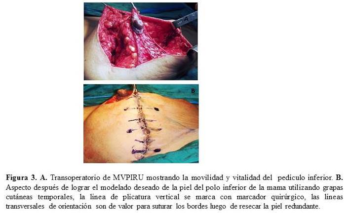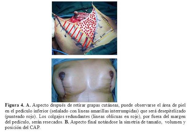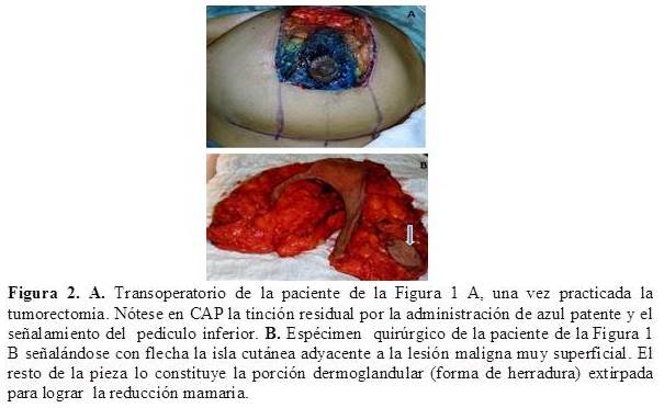 En reducción de mama por mamas hipertróficas el segmento de piel y parénquima mamario resecado, incluyendo la extirpación con criterios oncológicos del tumor, adoptó una forma de herradura (Figura 1,2).