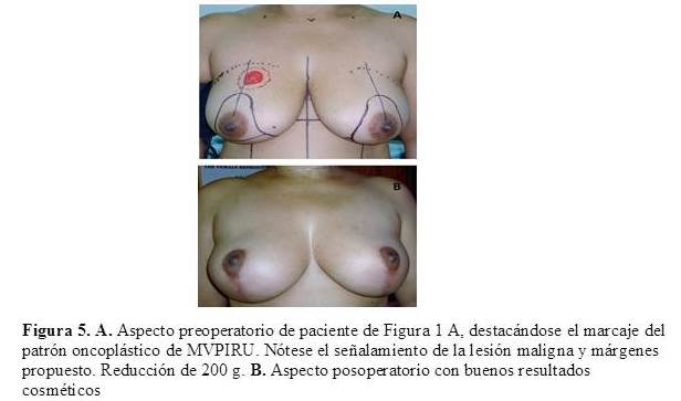 Abstract: OBJECTIVE: To evaluate the oncological (radiotherapy and surgery) and cosmetic results on voluminous breast patients with breast cancer who underwent conservative surgery applying breast reduction techniques in the Clinical family center, Puerto Ordaz, Bolívar. METHOD: Prospective study on six patients with voluminous breast and breast cancer treated with oncoplastic conservative surgery with reduction-pexia pattern: Vertical mammoplasty with inferior single branch pedicle. RESULTS: Six patients with breast cancer were operated with this technique. The mean of breast tissue reduced was 480 g in each breast (200 to 1 100 g). Sentinel lymph node biopsy was practiced in five patients (83 %) resulting positive in two of them (40 %), in one of the patients axillary metastases was confirmed by preoperative ultrasound guided biopsy. Axillary lymph node dissection was performed in three patients (50 %) without complications attributable to subareolar injection of patent blue or axillary dissection. Postoperative follow up has been made in four patients post radiotherapy noting satisfactory cosmetic outcomes without local or systemic recurrence for a mean period of 37 months (18 to 48 months). One patient (16 %) had a small wound dehiscence. CONCLUSIONS: The oncoplastic pattern represents an effective surgical technique in the conservative treatment of patients with voluminous breast and breast cancer, achieving oncological extirpation with excellent cosmetic outcomes, even in a long term after radiotherapy, additionally other benefits are obtain like an adequate imaging follow up and improvement of symptoms attributable to excessive breast weight.