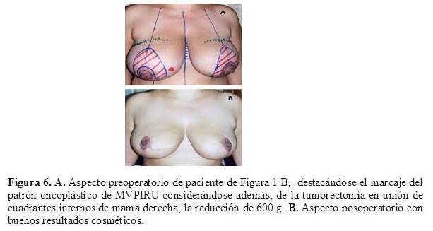 Finalmente en base a esta experiencia podemos concluir que los patrones oncoplásticos de reducción son técnicas quirúrgicas eficaces en el tratamiento conservador del cáncer de mama en pacientes con mamas voluminosas logrando la extirpación oncológica eficaz con excelentes resultados cosméticos.