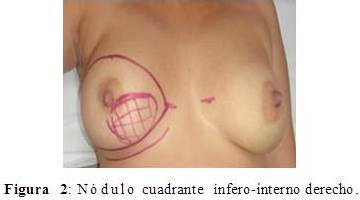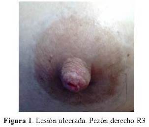 Paciente femenino de 45 años de edad, abuela y tía paterna con cáncer de mama, con enfermedad actual de un año de evolución dado por descarga lactescente por el pezón derecho, luego lesión costrosa y posteriormente nódulo sub-areolar ipsilateral, motivo por el cual acude a consulta en noviembre de 2013. Examen físico: ulcera en pezón derecho (R3) de 0,5 cm de diámetro, (Figura 1) sin secreción por pezón, nódulo sub-areolar ipsilateral, de 4 cm de diámetro en cuadrante ínfero interno (Figura 2) y adenopatía axilar derecha de 1,5 cm. Mamografía 13/11/2013: opacidad nodular en región retro-areolar y cuadrante ínfero-interno. Ultrasonido: tres nódulos sólidos contiguos, de bordes definidos, contenido homogéneo, en cuadrante ínfero derecho de 10,2 mm x 9,8 mm y 20 mm x 8,9 mm y 10 mm x 6,7 mm respectivamente.
