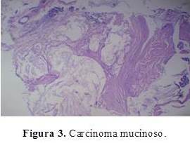 melanómico, entre ellos el cáncer basocelular es el más frecuente con un 70 % - 80 % de los casos. Pero el cáncer basocelular del complejo areola-pezón es una entidad poco común, que se ha incrementado el doble en comparación con otras décadas (1). En la revisión de la literatura se han reportado solo 40 casos, la mayoría en hombres, quizá debido a la exposición solar en la región del tórax. De ellos solo 2 casos presentaron metástasis ganglionar, lo cual representa menos del 1 %, por lo que es muy raro, atribuidos a dos factores, uno que estuviera asociado a cáncer de mama o que presentara invasión de tejido más profundo(2). Es más frecuente en el sexo masculino, edad promedio 49-75 años (3,4,5,6). Se presenta como una zona eritematosa, descamativa, ulcerada y descarga por el pezón. Es importante hacer diagnóstico diferencial con enfermedad de Paget, enfermedad de Bowen, melanoma amelánico y carcinoma ductal infiltrante. El carcinoma mucinoso es un cáncer ductal invasor de bajo grado de malignidad, representa menos del 1 % - 7 % de todos los cánceres infiltrantes, se caracteriza por células tumorales inmersas en cúmulos de moco extracelular. Es de mejor pronóstico que el resto de los carcinomas de mama y con menor frecuencia da metástasis ganglionar (7,8,9,10).