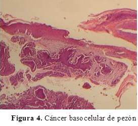 Se realizó PAAF en cuadrante ínfero-interno derecho (No 1545-2013): sugestivo de cáncer. Micro-biopsia eco-guiada con aguja gruesa de la misma lesión 04/11/2013 (No. 046): cáncer mucinoso (Figura 3). Acude a consulta para segunda opinión, se realizó biopsia de piel de pezón derecho el 21/11/2013 (No 1805) que reporta: carcinoma basocelular sólido (Figura 4).