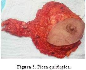 Se concluye como cáncer de mama mucinoso CT2 N1 M0 ST IIB y cáncer basocelular de pezón. Se realiza mastectomía radical de tipo Madden, el 03 de febrero 2014. (Figura 5). Se recibe resultado de biopsia No. 0313-2014: informando tumor que mide 5 cm, localizado en región retro-areolar, cuadrante ínfero-interno derecho de tipo ADC ductal infiltrante, piel y complejo areola-pezón, con foco de cáncer ductal in situ e infiltrante. En vista el resultado se envía láminas para revisión e inmunohistoquímica, la cual informa: carcinoma baso celular superficial, con bordes de resección libre de neoplasia e inmunohistoquímica No 046-13: cáncer mucinoso de la mama RE 60 % (+), RP 30 % (+), CerB2 1(+). Se concluye como: 1. Cáncer de mama infiltrante tipo mucinoso pT2 N0 M0 EST IIA RE 60 %, RP 30 %, CerB2- (-). 2. Cáncer basocelular de piel de pezón CT1N0M0 EST I. Recibió ocho ciclos de quimioterapia adyuvante (adriamicina/ciclofosfamida/taxotere) más radioterapia. Evoluciona en forma satisfactoria. Actualmente 2 años libre de enfermedad neoplásica.