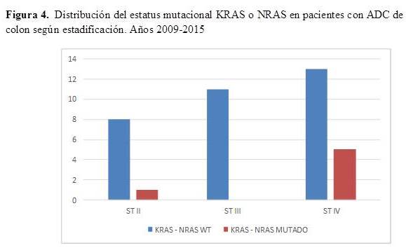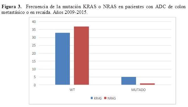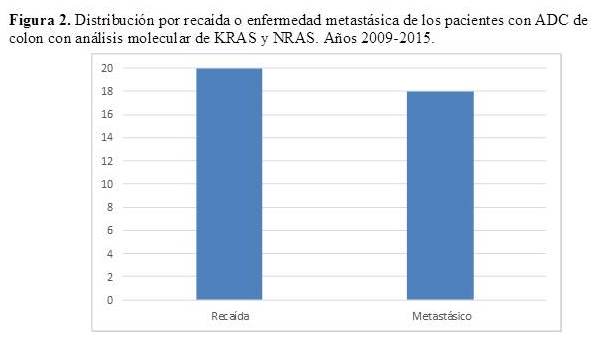 Se incluyeron en el estudio 38 pacientes con ADC de colon metastásico o en recaída, con evaluación molecular los genes KRAS y NRAS, durante los años 2009- 2015.