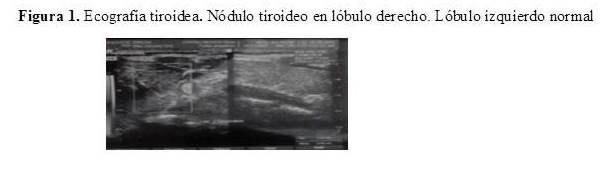Paciente femenina, de 58 años de edad, que acudió al servicio con tumor en región anterior del cuello, de 8 meses de evolución, sin otros concomitantes, la paciente se presenta totalmente asintomática. Al examen físico se constató cuello cilíndrico, asimétrico con palpación de lóbulo tiroideo derecho aumentado de tamaño, irregular, por la presencia de nódulo de consistencia sólida de aproximadamente 5 cm; lóbulo izquierdo normal sin adenomegalias en regiones laterales de cuello. Resto del examen físico normal.