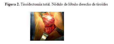 La paciente fue sometida a tiroidectomía total, en la que se constató glándula tiroidea aumentada de tamaño, con formación nodular única en lóbulo derecho de 5 cm - 6 cm de diámetro, de consistencia sólido-elástica, con adherencias firmes a la tráquea (Figura 2).