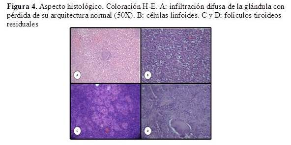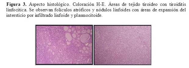 El estudio anatomopatológico informó linfoma en el lóbulo derecho de la tiroides compatible con linfoma MALT que no sobrepasa la cápsula tiroidea, descrito como: tejido tiroideo infiltrado por una proliferación difusa de células linfoides pequeñas, con presencia de folículos linfoides dispersos sin colonización y expansión difusa por células linfoides pequeñas, con algunas células grandes de aspecto centroblástico dispersas y otras áreas constituidas por células de aspecto plasmocitoide. Se identifican folículos tiroideos atróficos y con lesión linfoepitelial focal (Figura 3 y 4).