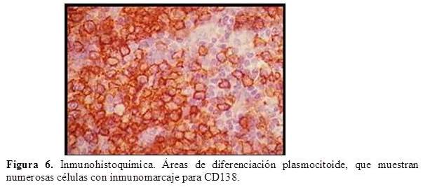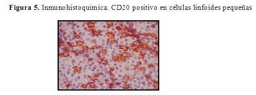 Las células malignas son linfocitos pequeños tipo centrocitos que rodean y colonizan los folículos; es frecuente el componente linfoplasmacítico y se puede observar nidos de células B monocitoides entre dicho componente y el de linfocitos pequeños tipo centrocito. Es importante considerar que las lesiones linfoides no neoplásicas pueden simular morfológicamente un linfoma primario de tiroides, principalmente de tipo MALT (7,8), por lo que las tinciones de inmunohistoquímica y, en algunas ocasiones, las técnicas de biología molecular pueden ser de utilidad (6,9). El diagnóstico del caso presentado fue confirmado mediante inmunohistoquímica con marcadores CD 20 y CD 79a, CD138 y CD45Ro para células neoplásicas lo cual es consecuente con múltiples reportes (5-7).