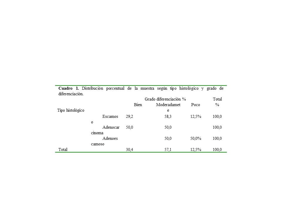 En el Cuadro 1 apreciamos el grado de diferenciación. En el caso de la histología escamosa casi el 60 % de los mismos era moderamente diferenciado; no se identiificaron casos bien diferenciados para las histologías adenocarcinoma y adenoescamoso.