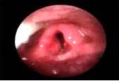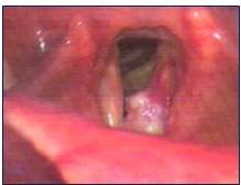 Paciente masculino de 60 años de edad, quien acude con disfonía continua de 2 meses de evolución, se realiza nasofibrolaringoscopia donde se evidencia lesión exofítica de cuerda vocal izquierda con cuerdas vocales móviles (Figura 1). En cuanto a las cualidades de la voz del paciente se observa voz grave y áspera, agravada de intensidad leve, se realiza laringoscopia directa más biopsia reportando carcinoma de laringe (T1), la tomografía de cuello reportó imagen de densidad intermedia que ocupaba plano glótico (cuerda vocal izquierda), se le plantea al paciente radioterapia o cirugía, practicándosele cordectomía izquierda a través de laringofisura con reconstrucción con banda ventricular (Figura 2). El paciente inició vía oral a las 48 h y se decanuló el día 7, las características de la voz del paciente son una voz áspera y tiene cinco años de operado sin evidencias de neoplasia laríngea.