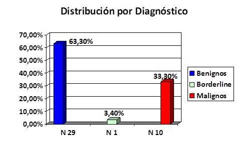 De los 30 pacientes operados se evidenció que la mayoría de las lesiones fueron benignas 19 (63,3 %), 10 pacientes presentaron lesiones malignas (33,3 %) y un paciente presentó una lesión de comportamiento intermedio (3,4 %) (Figura 1).