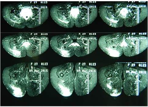La RMN es el estudio de elección para los tumores en la región glútea permitiendo evaluar bien la tumoración y su relación los las estructuras musculares, óseas y nerviosas presentes en ese espacio (Figura 6) (2,6).