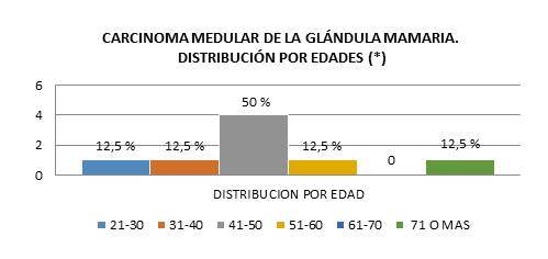 Las pacientes con carcinoma medular tienden a ser relativamente jóvenes y este tipo de carcinoma constituye por lo menos 10 % de los carcinomas diagnosticados en mujeres de 35 o menos años de edad. Moore y col. (3) encontraron que 59 % de sus pacientes eran menores de 50 años de edad. En nuestra serie, las pacientes menores de 50 años constituyeron el 75 % de la muestra.