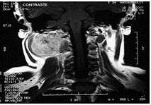 or este motivo se le realizó estudios imaginológicos como resonancia magnética nuclear (RMN) identificándose lesión ocupante de espacio (LOE) de bordes regulares que mide 10 cm x 6 cm, ubicado en región cervical profunda posterior y lateral derecha desde la base del cráneo hasta C3, de bordes regulares hiperintensa, con compresión de estructuras vasculonerviosas, pudiendo corresponder a un proceso sarcomatoso, sin descartar otro proceso de tipo neurofibroma (Figura 2).