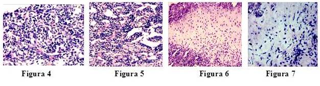 Se le realizó biopsia con aguja gruesa, evaluando cortes histológicos de 2µ, coloreados con hematoxilina y eosina, observándose neoplasia conformada predominantemente por células redondas pequeñas de núcleos redondos hipercrómicos sin nucleolos evidenciables y escaso citoplasma indiscernible, las células se disponen difusamente o separadas por abundantes vasos de aspecto hemangiopericítico, adicionalmente se observa alternando área con mayor densidad con otras de menor densidad en las cuales se identifica un material homogéneo anfófilo irregular, en un extremo se observa una matriz cartilaginosa hialina con focos de condorcitos maduros, calcificaciones irregulares y osificación endocondral, concluyendo: neoplasia maligna de células redondas compatible con condrosarcoma mesenquimático de región de la nuca. (Figura 4, 5, 6, 7).
