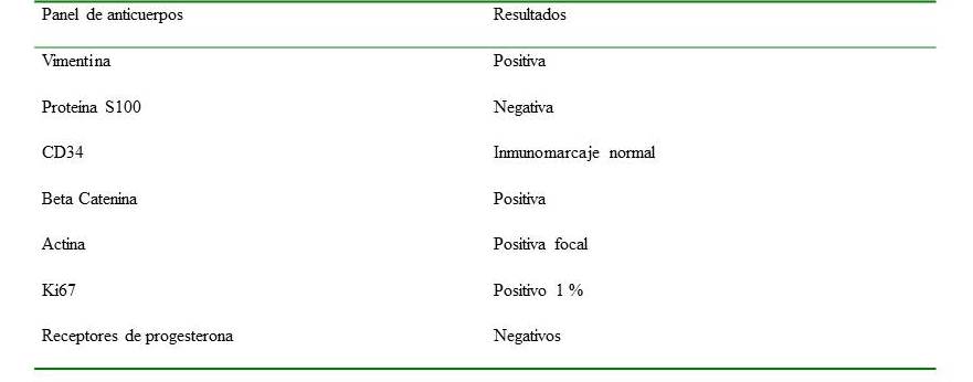 Examen físico. Hallazgos positivos: se evidencia LOE en tercio superior de hemitórax derecho entre línea clavicular media y línea axilar anterior, de 8 cm x 10 cm, pétreo, fijo, doloroso a la palpación. Mamas simétricas, pendulares, volumen pequeño, con evidencia de cicatriz en T invertida, hipertrófica, así como cicatriz vertical en pared lateral de hemitórax derecho, de 10 cm aproximadamente. Adenopatía axilar de 1 cm x 1 cm, móvil, renitente. Resto DLN. Biopsia Nº 5255: tumor torácico derecho, 14-07-15 neurofibroma. Informe inmunohistoquímica Nº I201600076, 19-01-16: reporta positivad para vimentina, proteína S-100, beta catetinina, actina (Cuadro 1).