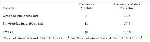 Durante el período de diciembre de 2009 hasta febrero de 2013, se incluyeron toda la población de pacientes que contaban con los criterios de inclusión para cáncer primario de vesícula biliar. Constituían 19 pacientes, tal como se observa el Cuadro 1. Al realizarse la evaluación del grado de obesidad según el tejido adiposo intra-abdominal, sólo 8 (42,2 %) clasificaban para esta variable.