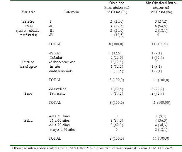 Las características de los pacientes se muestran en el Cuadro 2. Las cuatro variables evaluadas se clasifican según los casos con o sin obesidad intra-abdominal. El estadio clínico II era el que mayor número de casos tenía en cada grupo, con 3 (37,5 %) y 6 (54,5 %), respectivamente. En relación al subtipo histológico, los paciente del grupo con obesidad intra-abdominal tenían mayor casos de carcinomas indiferenciados, con 3 (37,5 %), siendo sólo 1 (9,1 %) en el grupo sin obesidad, donde predominaba el tipo tubular, con 8 (72,7 %). En ambos grupos el sexo femenino tenía mayor frecuencia de casos, con 7 (87,5 %) en los de obesidad intra-abdominal y 8 (72,7 %) en el grupo sin obesidad. Asimismo, el mayor grueso etáreo se hallaba en el intérvalo de 40 a 50 años y 51 a 60 años.