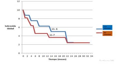 La Figura 1, recoge la sobrevida global. La media del tiempo de supervivencia es en el grupo sin obesidad de 13,6 meses y en el grupo a comparar de 11,7 meses. Se observa que la experiencia de supervivencia es aparentemente más favorable en el primero mencionado.