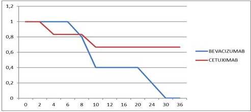 Intervalo de confianza 95 %. α = 3,84. Χ2 = 2,8186. Media cetuximab: >14 meses / Media bevacizumab: 14,8 meses.