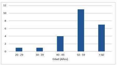 La edad media de los pacientes en el estudio fue de 54,05 años de edad; siendo de 50,1 años para el sexo femenino y 58 para el sexo masculino. La distribución por sexo con un total de 12 mujeres y 12 hombres. En la Figura 1 se encuentra representada la distribución etaria de los pacientes incluidos.