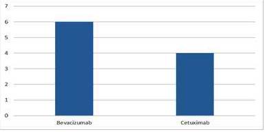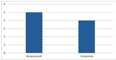 Vemos como la combinación de fluoropirimidinas + oxaliplatino fue el régimen de quimioterapia de elección en primera línea al compararlo con fluoropirimidinas + irinotecán (19 vs. 5); mientras que el anticuerpo monoclonal bevacizumab fue el medicamento asociado a la quimioterapia más utilizado en estos pacientes en primera línea de tratamiento, con un total de 9 pacientes con bevacizumab y 6 con cetuximab). Sin embargo, cuando se toma en cuenta sólo los pacientes cuyo análisis molecular de los genes KRAS / NRAS fue WT, a pesar de registrarse más pacientes con bevacizumab sobre cetuximab, la diferencia en valores absolutos fue menor, con un total de 6 pacientes con bevacizumab y 5 con cetuximab en primera línea de tratamiento.