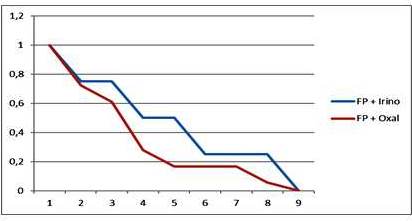 Se realizó un registro de la primera línea de tratamiento; siendo las fluoropirimidinas + oxaliplatino los agentes quimioterápicos de elección en este grupo de pacientes; seguidos de la combinación de fluoropirimidinas con irinotecán. Se realizó por el método de Kaplan Meier una curva en términos de ILP; para determinar si existe diferencias estadísticamente significativas entre ambas opciones de tratamiento como primera línea. Se obtienen resultados estadísticamente no significativos, hecho que es comparable con lo registrado en la bibliografía; donde Tourningand y col., concluyen que no existe diferencias entre iniciar tratamiento con 5FULV + oxaliplatino seguido de 5FULV + irinotecán, al compararlo con la secuencia inversa de tratamiento (10). En la literatura revisada, no logramos encontrar datos similares en población venezolana, que nos permitan una mejor aproximación al paciente con cáncer de colon metastásico, con el fin de discernir la mejor aproximación terapéutica para con nuestros pacientes, con el fin último de lograr beneficios en términos de ILP y SG.