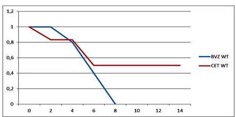 Por otro lado, tanto en enfermedad KRAS / NRAS WT como en presencia de mutaciones genéticas, fue bevacizumab el anticuerpo monoclonal más utilizado como primera línea de tratamiento en nuestra experiencia. Se realizó por el método de Kaplan Meier el análisis en términos de ILP y SG, para analizar el uso de cetuximab vs., bevacizumab en las variedad WT. No obtuvimos diferencias estadísticamente significativas; sin embargo, las curvas se separan y parecieran favorecer el uso de cetuximab en enfermedad WT, con aparente mayor beneficio en términos de SG. Estos hallazgos son compatibles con lo registrado en la bibliografía consultada; donde estudios de alto poder estadístico como el FIRE-3 trial, demuestran un claro beneficio del uso de cetuximab en primera línea de tratamiento, para pacientes WT (16). A pesar de estos hallazgos no concluyentes en nuestra experiencia, sugerimos estudios con mayor muestra y tiempo de seguimiento, preferiblemente de carácter prospectivo en nuestra población, para concluir sobre el beneficio de cetuximab sobre bevacizumab en enfermedad metastásica, sin mutación en los genes KRAS y NRAS. En la literatura registrada, no logramos obtener evidencias de estos hallazgos con valor estadísticamente significativo en población venezolana; siendo nuestra evidencia de importancia capital, en ausencia de trabajos que reflejen estos hallazgos.