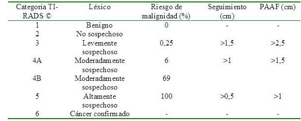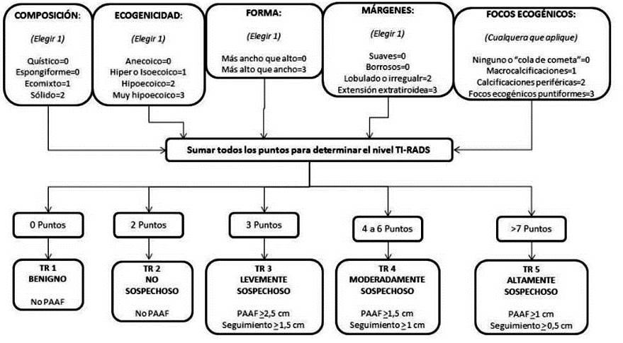 La biopsia por punción aspiración por aguja fina (PAAF) se debe realizar en base al tamaño del nódulo y a su categorización TI-RADS © (TR de 3 a 5), al igual que su seguimiento y se deben seguir las recomendaciones ACR TI-RADS © 2017 (V2) (Cuadro 1).