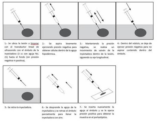 Se recomienda la utilización de agujas 22-23G y aspiración con inyectadora de 10 cm3 y bajo guía ecográfica. Se evalúa la vascularidad del nódulo a punzar. Si muestra mucha vascularidad al Doppler se realiza punción sin aspiración (por capilaridad). Se recomienda aspirar todo el contenido líquido y reservarlo para estudio citológico de centrifugado y apartarlo de la toma del componente sólido (3).