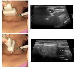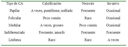Se debe incluir una evaluación ecográfica de los ganglios cervicales y se deben caracterizar sus hallazgos en caso de apariencia sospechosa: a. Forma b. Tamaño c. Presencia o no de microcalcificaciones y d. Si es posible vascularidad al Doppler color (Power)(2). En caso de detectar adenomegalias de carácter sospechoso debe realizarse estudio citológico y de ser posible, determinación de Tg en líquido de lavado de la aguja.