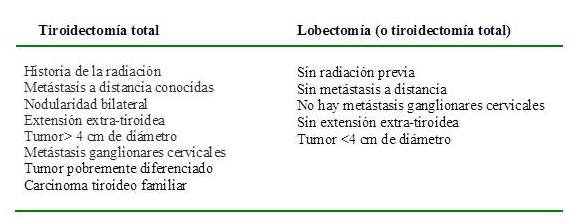 Las ventajas de la tiroidectomía total serían que la resección de todo el tejido tiroideo asegura la extirpación de una posible enfermedad multifocal oculta en el lóbulo contralateral, facilita la aplicación de yodo radiactivo adyuvante, mejorando en el posoperatorio la detección y tratamiento de enfermedad residual o metastásica y optimiza el uso de Tg sérica como un marcador para detectar enfermedad residual y/o recurrente.