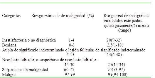Se reporta utilizando los grupos diagnósticos del Sistema Bethesda (38) para las muestras de citopatología tiroidea. Las categorías, el riesgo estimado de malignidad, media % actual de malignidad en nódulos extirpados (rango), son las siguientes: