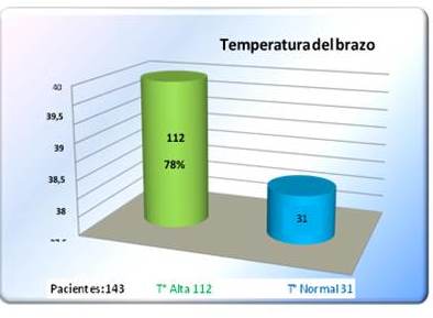 De 143 pacientes en estudio, el 78 % de los casos presentaron aumento en la temperatura del brazo y el 22 % presentaron temperatura normal. Una vez realizada la medición inicial se conformaron grupos de acuerdo al grado de temperatura registrada.