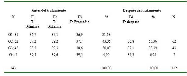 N: Número de pacientes por grupos T1: Temperatura mínima T2: Temperatura máxima T3: Promedio de la temperatura T4: Temperatura después del tratamiento