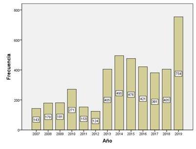 e recolectaron 4 388 casos de pacientes con cáncer de mama entre los años 2007 a 2019, logrando documentar la edad en 3 874 pacientes. La edad promedio fue de 54,37 años, con un rango de 73 años (21 a 94). El 40,3 % de las pacientes eran igual o menores de 50 años, mientras el 59,7 % eran igual o mayores de 51 años. Un 14,2 % del total de pacientes eran menores de 40 años. La distribución de los casos de acuerdo a los años del estudio se presenta en la (Figura 1).