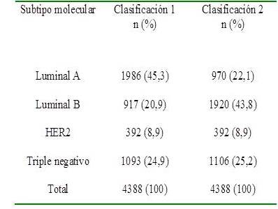 Abstract: The intrinsic molecular subtypes of breast carcinoma are essential to guide the treatment of patients. OBJECTIVE: The objective of this work was to determine the distribution of the molecular subtypes in Venezuelan women affected. METHOD: A retrospective study was carried out in 4 388 patients with infiltrating carcinoma of the breast and an immunohistochemically study of the estrogen and the progesterone receptors, HER2 and Ki-67. The cases were classified into Luminal A, Luminal B, HER2 and Triple Negative, according to the two systems: 1. Classical, based on the immunohistochemically expression of hormone receptors and HER2 and the 2 considering the 2015 Saint Gallen Consensus. RESULTS: The median age was 54.37 years old, with 40.35 % less than 50 years old. In the classical the Luminal A tumors were the most frequent (45.3 %); in the 2, the percentage of Luminal B carcinomas showed a significant increase (from 20.9 % to 43.8 %), due basically to a Ki-67 expression of more than 20 %. The Triple Negative cases had an elevated percentage (25 %) in the both classification systems. CONCLUSION: In conclusion, in this study shows that the breast carcinoma occurred at most early ages than in the developed countries, with a higher frequency of the Luminal B and the triple negative cases, being this cases associated with worse prognosis.