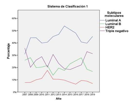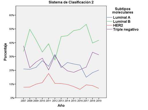 La distribución del porcentaje de los diferentes subtipos moleculares entre 2007 hasta el 2019, se representan en la (Figura 2 y 3). Se evidencian diferencias claras entre ambas clasificaciones, con inversión de la frecuencia de casos Luminal A y B. No se aprecia tendencia clara sostenida de aumento o disminución del porcentaje anual de alguno de los subtipos moleculares.