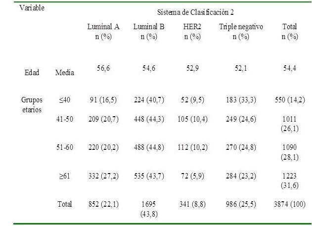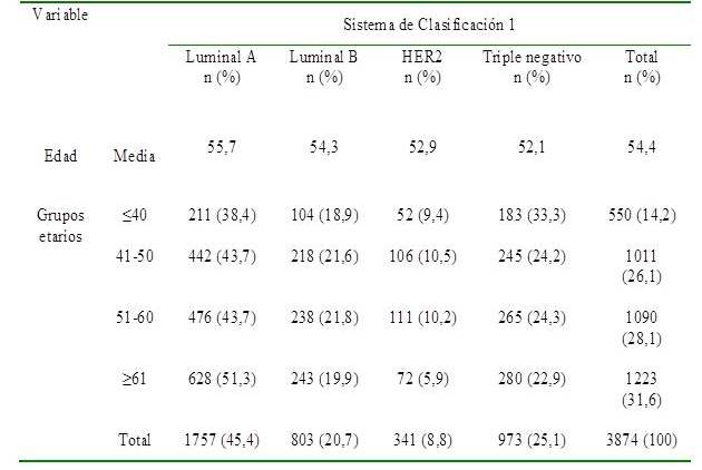 En los (Cuadros 3 y 4) se observa la relación entre los subtipos moleculares, según los dos sistemas considerados, y la edad. En las pacientes de mayor edad es más frecuente el subtipo Luminal A, mientras que en mujeres jóvenes se aprecia un porcentaje elevado de carcinomas TN. Esta característica se mantuvo en ambos sistemas de clasificación.