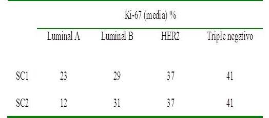 Adicionalmente, los tumores Luminal B fueron agrupados de acuerdo a la expresión de los RH, HER2, Ki-67 y los sistemas de clasificación 1 y 2 (Cuadro 2). Se observa como el subtipo RE+RP-HER2- es el más frecuente en el SC1, y como al incorporar el Ki-67, un alto número de casos previamente clasificados como como Luminal A pasan a Luminal B, constituyendo casi la mitad de éstos.