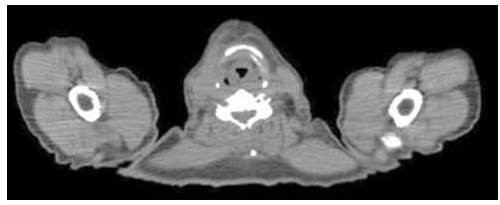 Se le realiza una tomografía diagnóstica en junio de 2018 de cuello, tórax y abdomen que informa proceso expansivo que afecta pliegue aritenoepiglótico y partes blandas adyacentes.
