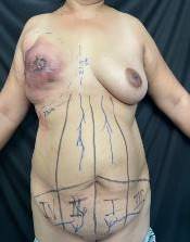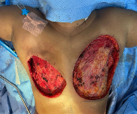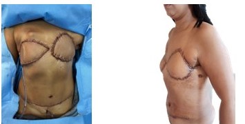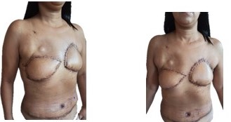Se discute en reunión multidisciplinaria y se interviene quirúrgicamente el 22/08/2022 donde se realiza mastectomía radical modificada tipo Madden derecha y mastectomia radical modificada tipo Forrest izquierda, colocación de cateter puerto más reconstrucción inmediata con colgajo miocutaneo bilateral TRAM unipediculado (Figura 10).