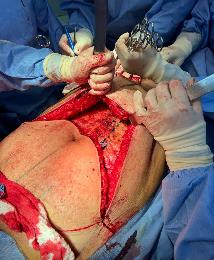 Bajo anestesia general, inhalatoria, protocolo de quirófano, primer tiempo quirúrgico a cargo de servicio de patología mamaria se realiza mastectomía radical modificada tipo Madden derecha más Mastectomía radical tipo Forrest izquierda, resultando en la mama derecha defecto de 16 cm x 11 cm, en mama izquierda 20 cm x 19 cm se incide la piel en ojal supra abdominal, hasta el pubis con la grasa biselada hacia arriba, con el fin de conservar el máximo número de perforantes peri-umbilicales. Se realiza de lateral a medial hasta llegar a la vaina del recto, se diseca superiormente hasta llegar a los rebordes costales y apéndice xifoides, creando un túnel subcutáneo que permita posteriormente el paso del colgajo, posteriormente se efectúo una incisión justo en la línea media de la vaina cada músculo recto a nivel inferior se procede a localizar y ligar la arteria epigástrica inferior profunda de cada lado, posteriormente se desinserta y libera el musculo recto del abdomen en su extremo inferior de manera bilateral para su traslado a los defecto, se hace una incisión en ojal en la cicatriz umbilical para conservar su irrigación y no desinsertarlo y se procede a elevar ambos colgajos miocutáneos, se realiza sutura en guardia griega con poliglactina 910 3-0 para generar hemostasia, el área donante se cierre inicialmente con una malla de polipropileno anclada a la aponeurosis remanente. Se coloca drenaje aspirativo, se hace la síntesis del colgajo dermograso inicialmente con puntos cardinales, se marca la ubicación de la cicatriz horizontal y mediante una incisión horizontal se procede a realizar la fijación del mismo al colgajo dermograso.
