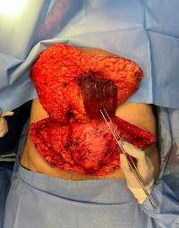 Bajo anestesia general inhalatoria, protocolo de quirófano, 1er tiempo quirúrgico a cargo de servicio de patología mamaria se lleva a cabo la mastectomía radical modificada tipo Madden derecha, resultando en un defecto de 25 cm x 22 cm (Figura 2), en segundo tiempo se incide la piel en ojal supra abdominal, hasta el pubis con la grasa biselada hacia arriba con el fin de conservar el máximo número de perforantes peri-umbilicales. Se ejecutó de lateral a medial hasta llegar a la vaina del recto, se diseca superiormente hasta llegar a los rebordes costales y apéndice xifoides, creando un túnel subcutáneo (Figura 3), que permitió posteriormente el paso del colgajo, subsiguientemente se realizó una incisión justo en la línea media de la vaina del músculo recto izquierdo, a nivel inferior se procede a localizar y ligar la arteria epigástrica inferior profunda, inmediatamente se desinserta y libera el músculo recto del abdomen en su extremo inferior para su traslado al defecto, se hace una incisión en ojal en la cicatriz umbilical para conservar su irrigación y no desinsertarlo, luego se procede a levantar el colgajo, se efectúa sutura en guardia griega con poliglactina 910 3-0 en músculo recto, para generar hemostasia, el área donante se cierre inicialmente con una malla de polipropileno anclada a la aponeurosis remanente. Se coloca drenaje aspirativo, se hace la síntesis del colgajo dermograso inicialmente con puntos cardinales, se marca la ubicación de la cicatriz horizontal y mediante una incisión horizontal se procede a realizar la fijación del mismo al colgajo dermograso (Figura 4).