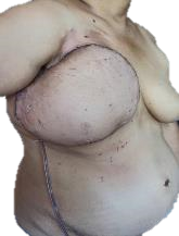 Se realiza mastectomía radical modificada tipo Madden en mama derecha el 11/07/2022 por servicio de patología mamaria más reconstrucción inmediata con colgajo miocutáneo ,unipediculado de recto abdominal transverso contralateral por servicio de cirugía plástica, evolucionó satisfactoriamente durante las primeras 72 h, sin embargo, presentó epidermólisis (Figura 6) la cual evolucionó con necrosis grasa y dehiscencia al séptimo día de posoperatorio presentando dehiscencia de borde lateral del colgajo, se toma de cultivo, curas diarias, desbridamiento de herida, afrontamiento de bordes con nylon 3-0 (Figura 7), con cicatrización completa de la herida a los 35 días de posoperatorio (Figura 8).