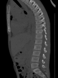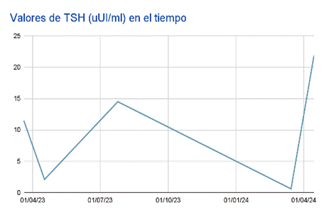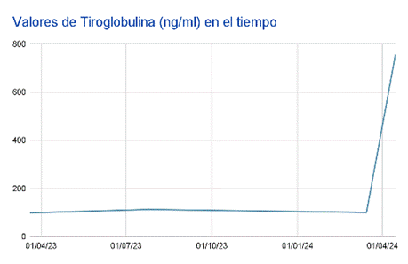 En agosto del mismo año, se complementan estudios imagenológicos con US abdominal donde se observa imagen en segmento hepático en probable relación a hemangioma y litiasis vesicular. Adicionalmente, una TC de cráneo, cuello, tórax, abdomen y pelvis con contraste endovenoso donde se observa: tejido residual tiroideo, enfermedad ganglionar cervical bilateral, tórax de patrón micronodular centrolobulillar difuso y engrosamiento nodular cisural bilateral (Figura 4), lesión lítica central con halo grueso esclerótico a nivel de T11 (Figura 5) y de aspecto festoneado de endostio de glenoides izquierda (Figura 6); a nivel renal se contemplan áreas hiperrefringentes no categóricas (Figura 7), pero que coinciden con las áreas de hipercaptación del radiofármaco del RCT. La cinética de los valores de tiroglobulina (Tg) y de la hormona estimulante de la tiroides (TSH) se encuentran en la Figura 11 y 22.