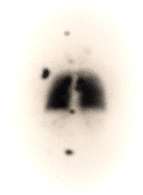 Asiste a la Unidad de Medicina Nuclear, adjunta a la cátedra de Radioterapia y Medicina Nuclear del Hospital Universitario de Caracas (HUC) en julio de 2023 y posterior a evaluación y discusión de caso con especialistas (Médicos Nucleares) internacionales se cataloga como un CPT de alto riesgo, pT4 pN1b M1 (11) según la Asociación Americana de Tiroides (ATA, según sus siglas en inglés) pediátrica 2015 (12), y se decide administrar una dosis de 50 mCi de yodo radiactivo (RAI 131I); una semana posterior a la terapia ablativa se realiza rastreo corporal total (RCT) donde se observa: presencia de tejido yodo captante en región anterior del cuello en relación a remanente posquirúrgico, intensa captación en ambos campos pulmonares, captaciones dispersas en sistema esquelético (cráneo, columna dorsal, hombro izquierdo, pelvis, articulación coxofemoral y fémur derecho). Adicionalmente, captación focal en pared abdominal anterior y en ambos riñones (Figura 2 y 3).