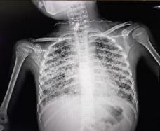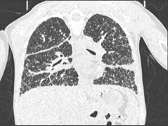 Este caso trata de un escolar masculino de 10 años de edad, cuyo familiar refiere inicio de enfermedad actual en febrero de 2022, cuando presenta cefalea persistente, acuden a centro de salud en diciembre de ese mismo año y posterior a evaluación clínica evidencian saturación de oxígeno al 70 %, por lo que solicitan estudio de imagen Tomografía Computarizada (TC) de tórax de alta resolución, donde se observan numerosos nódulos de pequeño tamaño, bien definidos, distribuidos uniformemente en ambos campos pulmonares y engrosamiento pleural (Figura 1) la cual concluyen como: neumonía bilateral por tuberculosis miliar vs., neumonía intersticial linfocítica; es ingresado con diagnóstico de infección respiratoria baja granulomatosa vs., fúngica.